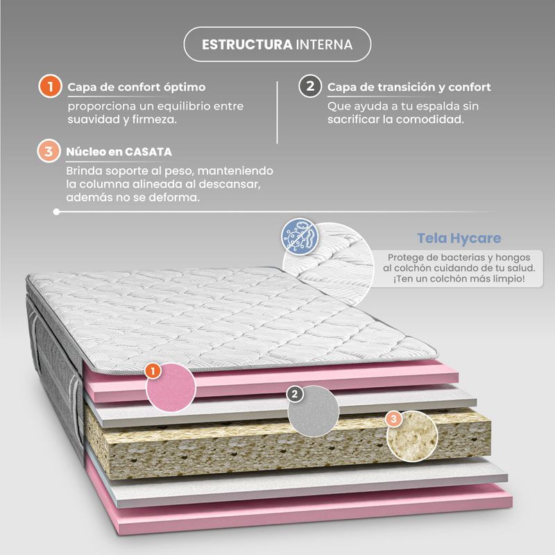 El núcleo de casata es el secreto de su durabilidad y resistencia, mientras que su tela Hycare protege contra alérgenos y bacterias, manteniendo el colchón fresco e higiénico por más tiempo.